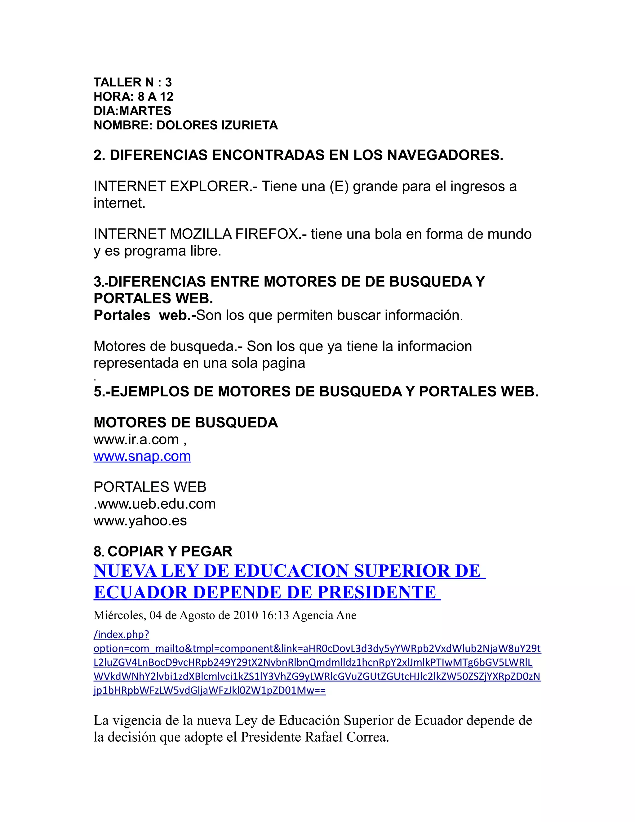 El documento presenta información sobre un taller que se llevará a cabo el martes de 8 a 12 con Dolores Izurieta. También discute las diferencias entre navegadores de internet, motores de búsqueda y portales web, y proporciona ejemplos de cada uno. Por último, incluye definiciones de varios términos relacionados con la tecnología.