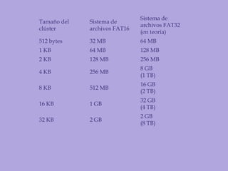 El documento explica varios conceptos relacionados con discos duros y sistemas de archivos. Define qué es un jumper, y explica las diferencias entre los sistemas de archivos FAT16, FAT32 y NTFS. También describe las particiones primarias, extendidas y lógicas, y las funciones de los programas Format y Fdisk.