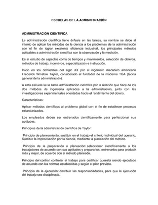 El documento presenta un resumen de las diferentes escuelas de la administración, incluyendo la administración científica, la administración empírica, la escuela ambiental, la escuela del comportamiento humano, la escuela del sistema social, la administración de sistemas, la teoría de las decisiones, la escuela cuantitativa, la escuela neohumana y la escuela ecléctica. Describe los principios y autores clave de cada escuela.