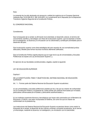 El documento presenta información sobre varios temas relacionados con la educación superior en Ecuador. Establece que el Consejo Nacional de Educación Superior (CONESUP) es el organismo regulador del sistema de educación superior del país. También describe la composición y funciones de la Asamblea de la Universidad Ecuatoriana y del CONESUP. Finalmente, detalla algunos de los principios y objetivos generales del sistema de educación superior ecuatoriano.