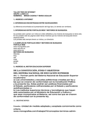 El documento presenta un resumen del taller número tres de internet realizado por el grupo del lunes. Se describen las actividades realizadas como el ingreso a internet, las diferencias entre navegadores y portales web vs motores de búsqueda, ejemplos de cada uno, y la revisión de conceptos relacionados a la tecnología de la información.