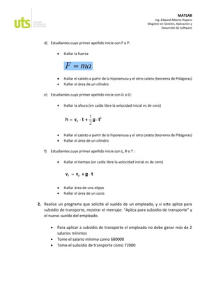 El documento presenta 6 ejercicios propuestos para estudiantes en MATLAB. El primer ejercicio pide crear funciones para calcular diferentes fórmulas matemáticas según el apellido del estudiante. El segundo ejercicio pide crear un programa que determine si un empleado califica para subsidio de transporte basado en su sueldo. El tercer ejercicio pide crear un programa para convertir una temperatura de Fahrenheit a Celsius. Se pide entregar el código y resultados de cada ejercicio.
