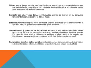 Este documento presenta una serie de normas para el buen uso de Internet por parte de los niños y adolescentes. Recomienda establecer límites de tiempo para el uso de Internet, compartir el tiempo en línea con los hijos para fomentar la comunicación, y enseñarles a ser críticos y respetuosos con los demás en la red. También aconseja no revelar información personal en línea, establecer normas comunes con otros padres, y monitorear la actividad en línea de los hijos para garantizar su seguridad.