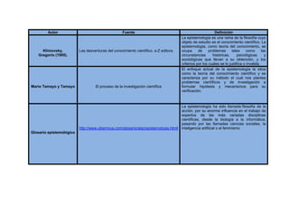 El resumen analiza tres definiciones de epistemología de diferentes fuentes. Dos autores definen la epistemología como la teoría del conocimiento científico y su método, mientras que una fuente la describe como la filosofía que influye en el trabajo experto de varias disciplinas a través de la investigación. El autor establece semejanzas y diferencias entre las definiciones y provee su propia definición de epistemología como una ciencia de apoyo a todas las áreas a través de herramientas de investigación.