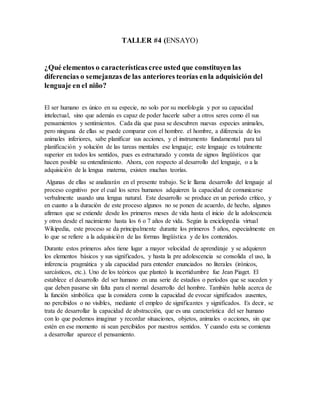 Este documento resume varias teorías sobre la adquisición del lenguaje en los niños. Menciona que Jean Piaget planteó que el desarrollo del lenguaje ocurre a través de etapas cognitivas. Piaget creía que el lenguaje se estructura a través de las estructuras cognitivas y que el pensamiento afecta el lenguaje hablado. También discute la teoría de Vygotsky, quien creía que el lenguaje depende de la interacción con el entorno más que del desarrollo cognitivo. El