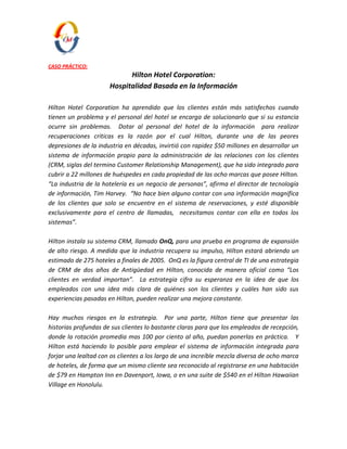 Este documento describe el sistema de información de gestión de relaciones con clientes (CRM) llamado OnQ implementado por Hilton Hotel Corporation. OnQ permite al personal del hotel acceder a información detallada de 22 millones de huéspedes para brindar un mejor servicio. El sistema costó $50 millones y ayudó a aumentar la tasa de coincidencia de reservas con perfiles de clientes de 2 de cada 10 a 4.7. Hilton continúa desarrollando software propio para OnQ para mantener una ventaja competitiva.
