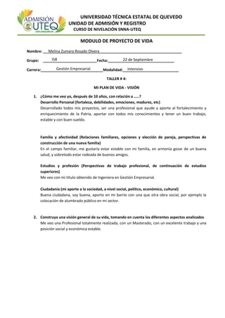 Este documento es un taller sobre la visión de vida a largo plazo de un estudiante. El estudiante describe su visión para los próximos 10 años en varias áreas como desarrollo personal, familia, estudios y profesión, y ciudadanía. El estudiante espera ser una profesional que ayude a su país, tener una familia estable y buena salud, obtener su título en Gestión Empresarial, y contribuir a su comunidad a través de obras sociales. En general, la visión del estudiante es convertirse en una profesional