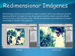 El documento describe diferentes herramientas de edición de imágenes en Photoshop como aumentar, reducir, recortar, usar la barita mágica, agregar marcos rectangulares y usar las herramientas de selección de lazo para cambiar el fondo de una imagen. Explica cómo utilizar cada una de estas herramientas paso a paso con ejemplos de imágenes antes y después de la edición.