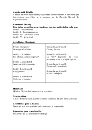 Este taller tiene como objetivo que los alumnos con capacidades sobresalientes mejoren sus habilidades sociales y emocionales a través de cuatro sesiones que cubren temas como la respiración, las emociones, las relaciones con los demás y la propia actitud. Cada sesión incluye dos actividades experienciales diseñadas para crear conciencia corporal, emocional y social. El taller busca que los estudiantes logren mejores relaciones interpersonales a partir de cambios internos en la gestión de emociones y la comunicación no