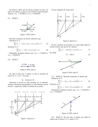El documento detalla un análisis estructural mediante el método de los nodos, en el que se determina la fuerza en cada miembro de varias estructuras y se especifica si están en tensión o compresión. Se presentan múltiples ejercicios con diagramas y cálculos que ilustran las sumatorias de fuerzas y momentos en diferentes nodos. Los resultados finales incluyen fuerzas específicas en kilonewtons y en libras para los distintos elementos considerados en los ejercicios.