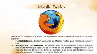 El documento proporciona información sobre diferentes navegadores web como Firefox, Chrome, Internet Explorer, Opera y Mozilla Firefox. Describe algunas de sus características clave como su disponibilidad en múltiples plataformas, navegación por pestañas, seguridad, rendimiento y velocidad.