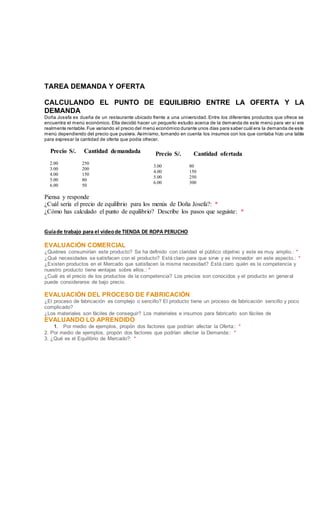 El documento analiza la demanda y oferta del menú económico de un restaurante, determinando el precio de equilibrio al comparar precios con la cantidad demandada y ofrecida. Se discuten factores que afectan tanto la oferta, como la tecnología y regulaciones gubernamentales, así como factores que influyen en la demanda, como precios y demografía. Además, se explica el concepto de equilibrio de mercado, donde la cantidad demandada iguala a la cantidad ofrecida.
