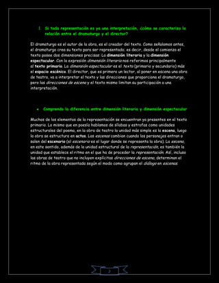 El documento describe la relación entre el dramaturgo y el director en el teatro. El dramaturgo crea la obra literaria original, que incluye elementos para la representación escénica. El director interpreta el texto del dramaturgo y lo lleva a escena, pero debe ceñirse a la visión del dramaturgo. La obra tiene dos dimensiones: literaria, que es el texto primario, y espectacular, que incluye el texto y el espacio escénico. El director da vida a la obra a través de su interpretación dentro de los límites establecidos por el dramaturgo.