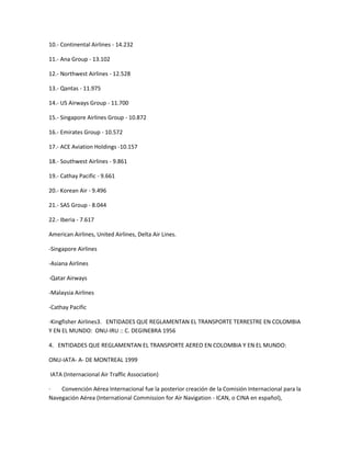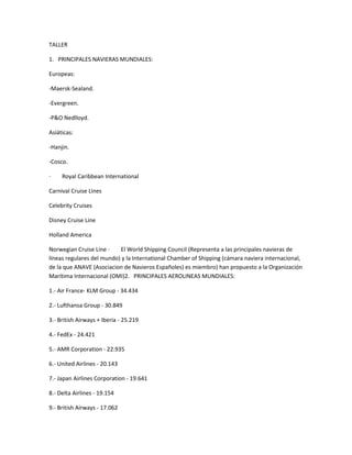 Este documento describe las principales empresas de transporte mundiales, incluyendo aerolíneas como Air France-KLM Group y Lufthansa Group, navieras como Maersk y Evergreen, y organismos que regulan el transporte terrestre, marítimo y aéreo a nivel mundial y en Colombia como la ONU, IATA y OACI. También se mencionan tasas de cambio como la tasa Alaico y Asonav usadas en el transporte aéreo y marítimo en Colombia.