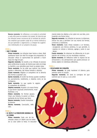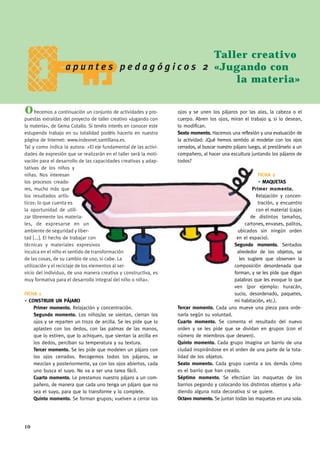 Este documento presenta seis fichas con actividades creativas para un taller. La Ficha 1 involucra modelar pájaros de arcilla con los ojos cerrados y luego intercambiarlos. La Ficha 2 implica ordenar objetos reciclados para crear maquetas de barrios imaginarios. La Ficha 3 trata de hacer formas de masa y regalarlas. La Ficha 4 se enfoca en percibir formas táctiles y expresarlas artísticamente. La Ficha 5 involucra sentir el ritmo cardíaco caminando. La F