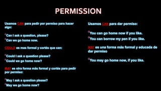 Este documento proporciona instrucciones sobre cómo pedir permiso, hacer solicitudes y dar consejos en inglés. Explica las diferencias entre palabras como "can", "could", "may" y "must" para pedir permiso de manera formal o informal, y entre "should", "could" y "must" para hacer sugerencias o indicar obligaciones.