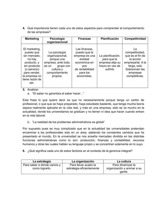 La gerencia integral busca maximizar la competitividad de una organización mediante la integración de todas sus funciones y procesos. Esto incluye definir una estrategia clara, organizar eficientemente la empresa para ejecutarla, y motivar al personal para que dinamice la organización. Diferentes enfoques han primado a lo largo de los años, como la organización en las décadas de 1950 y 1960, la estrategia en los 1970, y la cultura organizacional en los 1980.