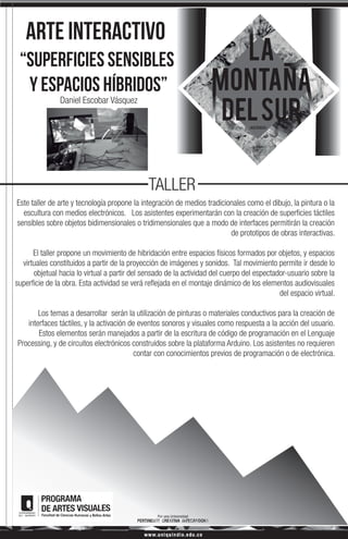 Este taller de arte y tecnología propone experimentar con la creación de superficies táctiles sensibles en objetos bidimensionales y tridimensionales que permitan prototipos de obras interactivas. El taller explorará la hibridación entre espacios físicos y virtuales, permitiendo que la actividad del espectador en la superficie de la obra se refleje dinámicamente en elementos audiovisuales. Los asistentes aprenderán a utilizar pinturas conductoras y circuitos electrónicos en Arduino para crear interfaces táctiles que activen eventos sonoros