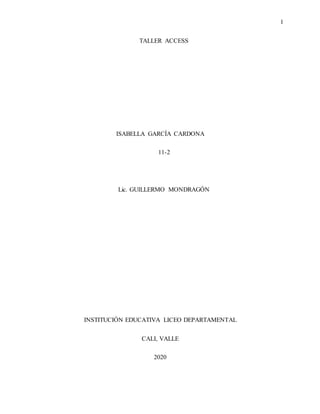 Access es un software de gestión de bases de datos relacionales que permite crear, almacenar y analizar datos organizados en tablas, campos, claves primarias e índices. Las tablas contienen filas y columnas para almacenar datos de forma ordenada, los campos son unidades de información agrupadas en registros, las claves primarias identifican registros de manera única y los índices mejoran la velocidad de búsqueda de registros.