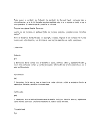 El documento discute los beneficios del software libre en la educación y las licencias Creative Commons. El software libre puede proporcionar herramientas que apoyen el proceso de enseñanza y aprendizaje de manera gratuita y abierta. Las licencias Creative Commons ofrecen opciones para compartir obras de manera que otros puedan usarlas y modificarlas, lo que puede promover el acceso a los contenidos educativos.