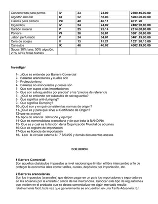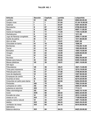 Este documento proporciona una lista de productos con sus respectivos códigos arancelarios según la sección, capítulo, partida y subpartida a la que pertenecen de acuerdo a la nomenclatura arancelaria. La lista incluye productos como ladrillos, ovejas, calamar, remolacha, melón, avena en hojuelas, jugo de naranja congelado, aceite de palma, atún en lata, chocolate en barra, bombones, tamales, buñuelos, vinos, revistas, mesas plásticas,