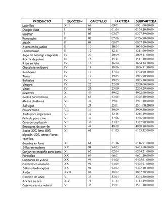 Este documento clasifica diferentes productos según su naturaleza y ubicación en la subpartida arancelaria. Proporciona la sección, capítulo, partida y subpartida para cada producto como ladrillos, ovejas vivas, calamar, remolacha y más. El propósito es identificar correctamente cada producto de acuerdo a su clasificación arancelaria.