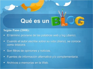Un blog es un sitio web que recopila cronológicamente textos o artículos de uno o varios autores. Se compone de páginas estáticas con información general y de entradas o posts que se actualizan constantemente en orden inverso de antigüedad. Los blogs sirven para comunicar e informar, hacer marketing, compartir información, enseñar, convocar y dar opiniones. Pueden ser personales, institucionales, temáticos u otros. Para crear un blog se elige un nombre atractivo, se construye de forma cómoda para la