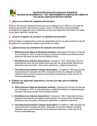 El documento presenta información sobre un taller de cableado estructurado impartido en la Institución Educativa Braulio González. Explica conceptos como sistema de cableado estructurado, sus objetivos y estándares. Describe componentes como patch panel, patch cord, jack, keystone, entre otros que componen un puesto de trabajo. También cubre temas como distancias máximas de cableado horizontal, elementos de un gabinete de telecomunicaciones y comparación entre cables UTP, STP, coaxial y fibra óptica.
