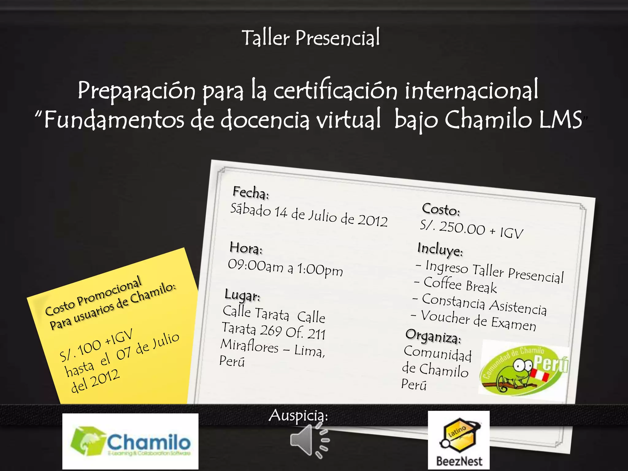 Este documento anuncia un taller presencial para prepararse para la certificación internacional en fundamentos de docencia virtual bajo el sistema de gestión de aprendizaje (LMS) Chamilo. El taller cubrirá temas clave del examen de certificación e incluirá ejercicios prácticos. Se llevará a cabo en Lima, Perú y ofrece acceso al examen de certificación el mismo día.