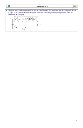 Este documento presenta un taller sobre circuitos eléctricos con cuatro problemas para resolver. El primer problema involucra calcular la diferencia de potencial y corriente en un circuito con dos bobinas en paralelo. El segundo problema pide calcular la lectura de un voltímetro conectado a un acumulador. El tercer problema involucra calcular el voltaje necesario para cargar una batería de tres celdas en serie. El cuarto problema trata sobre calcular la corriente y diferencia de potencial en cada pila de una serie de seis pilas AA.