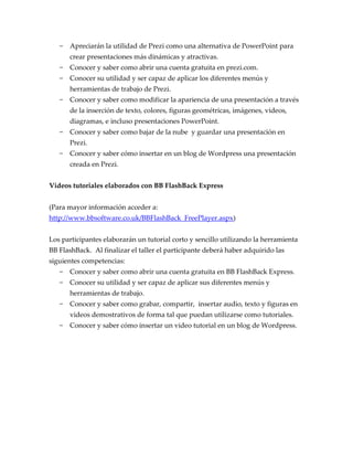 El taller cubrió tres herramientas web para el salón de clases: Wordpress para crear blogs, Prezi para hacer presentaciones dinámicas, y BB FlashBack Express para videos tutoriales. Los participantes aprenderían cómo usar las funciones básicas de cada herramienta, como abrir cuentas, modificar apariencias, y publicar contenido en blogs o presentaciones. El objetivo final era que los asistentes pudieran aplicar estas herramientas para crear recursos educativos digitales.