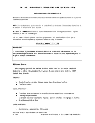 El documento describe un taller sobre métodos de enseñanza en educación física. Se presenta el método de mando directo, el cual tiene un enfoque militar donde el profesor controla e instruye a los estudiantes de forma masiva y rígida. Se describen las características del papel del profesor y los estudiantes, así como la planificación y desarrollo de la clase bajo este método. También se menciona una variación de este método con mayor flexibilidad.