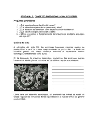 El documento describe el contexto post-revolución industrial a principios del siglo XX, cuando las empresas buscaban aumentar la productividad a través de la división del trabajo, la especialización de tareas, y la producción en serie. Los trabajadores experimentaban difíciles condiciones laborales bajo una supervisión estricta, lo que llevó al surgimiento de los sindicatos.