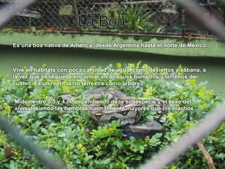 El documento presenta información sobre diversas especies animales, incluyendo detalles sobre su hábitat, alimentación, reproducción y otras características. Se describen animales como la boa, pitón, cebra, papión sagrado, chimpancé, león, elefante africano, flamenco rosado, grulla coronada, mono ardilla, grulla del paraíso, venado colorado, bisonte americano, avestruz, casuario, garzón soldado, danta, hipopótamo, jaguar, tigre de Bengala, búho