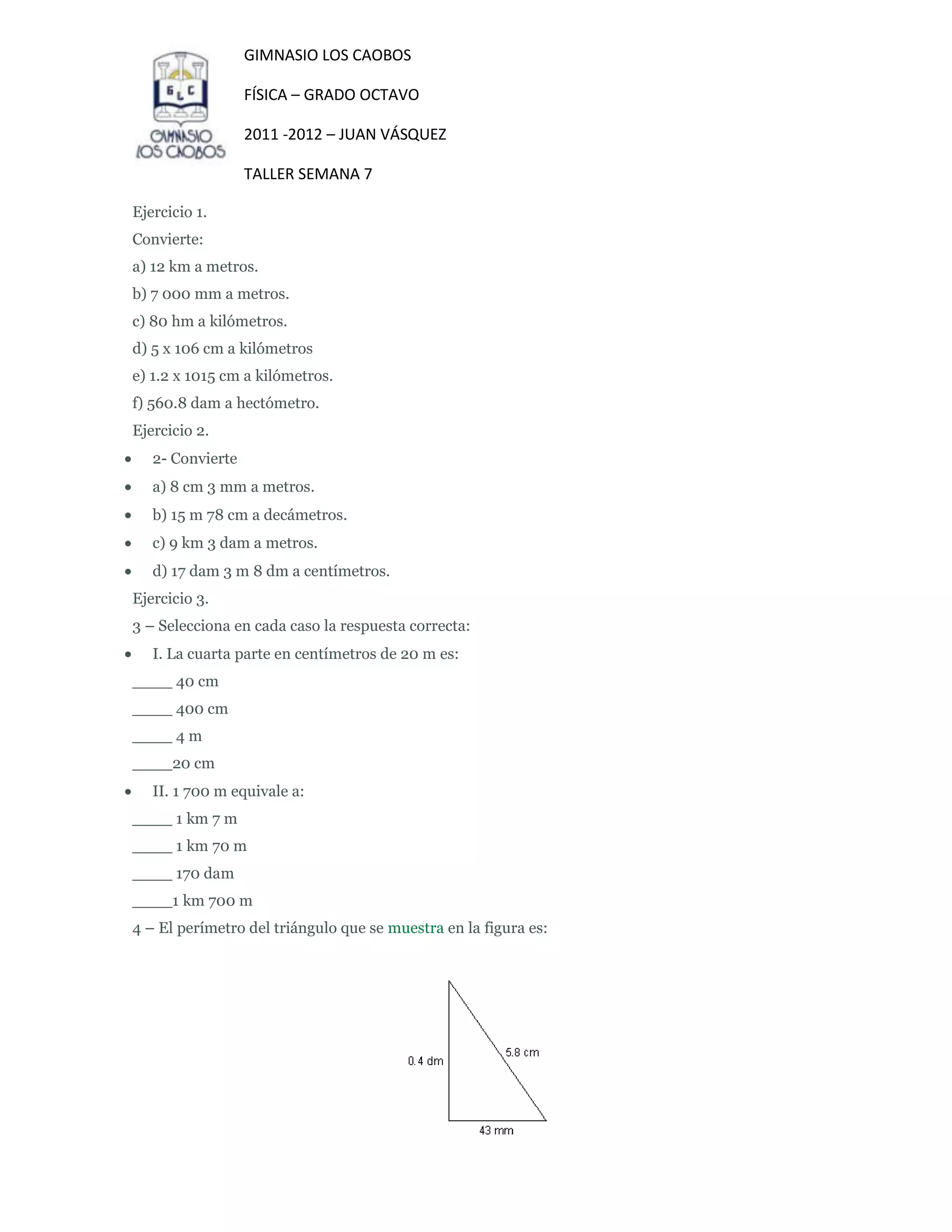 Este documento presenta 11 ejercicios de conversión de unidades de longitud como metros, kilómetros, centímetros, etc. Incluye conversiones como 12 km a metros, 7 000 mm a metros y 80 hm a kilómetros. También incluye cálculos como encontrar el perímetro de un triángulo dado y la distancia que una persona recorre diariamente entre su casa y la escuela.