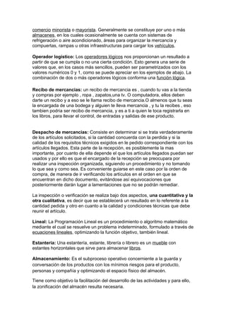 El documento habla sobre el cross docking, que es una técnica logística que permite la transferencia de mercancías de un medio de transporte a otro sin almacenarlas, con el fin de agilizar los procesos. Se describen los tipos de cross docking, códigos de barras y el estándar EAN 128 para la identificación de productos. También menciona conceptos logísticos como recepción, almacenamiento, distribución y su importancia para la gestión eficiente de inventarios.