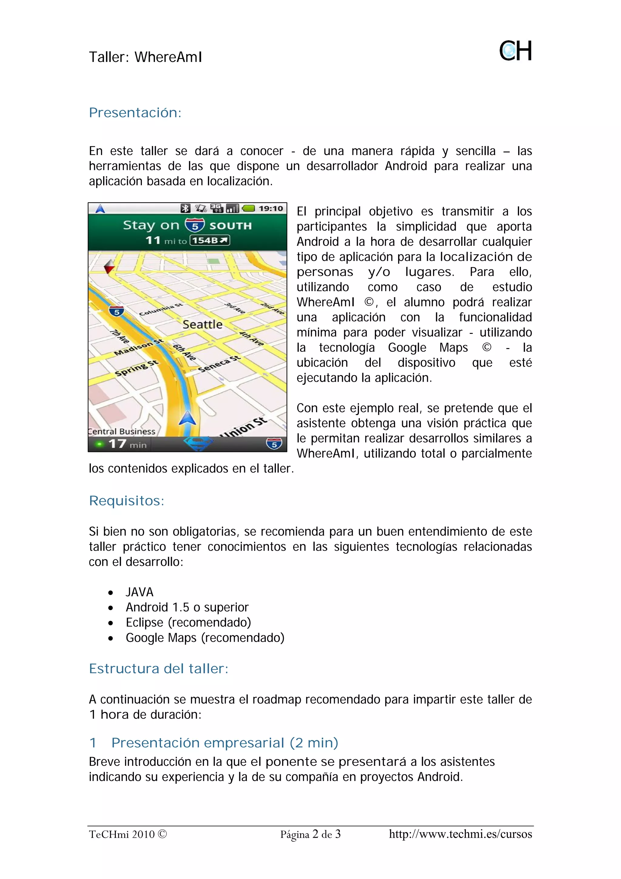 El taller 'whereami' se centra en enseñar a los desarrolladores cómo crear aplicaciones Android basadas en localización utilizando Google Maps. A través de un caso práctico, los participantes aprenderán a desarrollar una aplicación mínima que muestra la ubicación del dispositivo. Se recomienda tener conocimientos previos en Java y Android para un mejor entendimiento del taller.