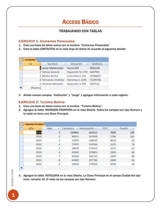 Este documento presenta una serie de ejercicios prácticos para trabajar con Access. Incluye ejercicios sobre tablas, consultas, relaciones, formularios y reportes utilizando bases de datos como Contactos Personales, Turismo Bolivia, Biblioteca y Gimnasio. También incluye dos trabajos prácticos utilizando bases de datos para una Agencia de Viajes e Instituto de Computación.