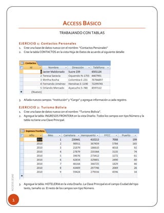 Este documento presenta una serie de ejercicios prácticos para trabajar con Access. Incluye ejercicios sobre tablas, consultas, relaciones, formularios y reportes utilizando bases de datos como Contactos Personales, Turismo Bolivia, Biblioteca y Gimnasio. También presenta dos trabajos prácticos utilizando bases de datos para una Agencia de Viajes e Instituto de Computación.