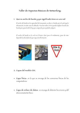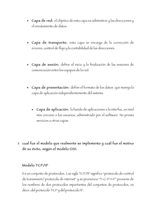 El documento presenta información sobre conceptos básicos de redes como ancho de banda, el modelo OSI, los protocolos TCP/IP y su éxito, así como las características y diferencias entre LAN, WAN y MAN. También incluye una sección con definiciones de términos desconocidos relacionados con redes.