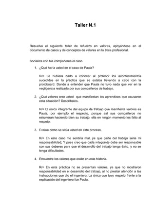 Este documento presenta un taller sobre ética profesional que incluye un caso sobre una estudiante llamada Paula. En el caso, los compañeros de Paula no prestaron atención a las instrucciones del ingeniero durante una práctica y causaron un problema, pero Paula fue respetuosa. El taller incluye preguntas sobre cómo manejaría el estudiante la situación de Paula, los valores y anti-valores presentes, y reflexiones sobre la responsabilidad profesional.