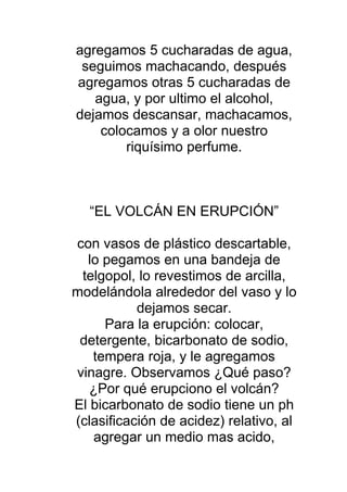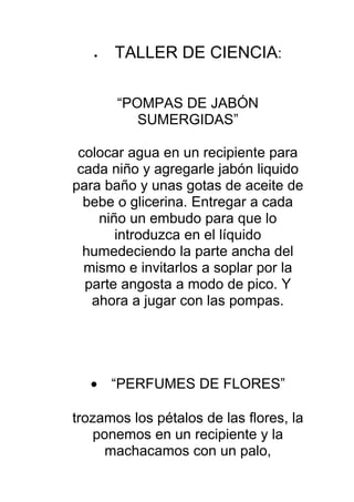 El documento presenta cuatro experimentos científicos para realizar en un taller con niños: 1) hacer pompas de jabón sumergiendo un embudo en agua con jabón y aceite, 2) hacer perfumes naturales machacando pétalos de flores en agua y alcohol, 3) simular una erupción volcánica usando vasos, arcilla, detergente, bicarbonato y vinagre, 4) demostrar que el aire ocupa espacio inflando globos luego de una reacción química en una botella.