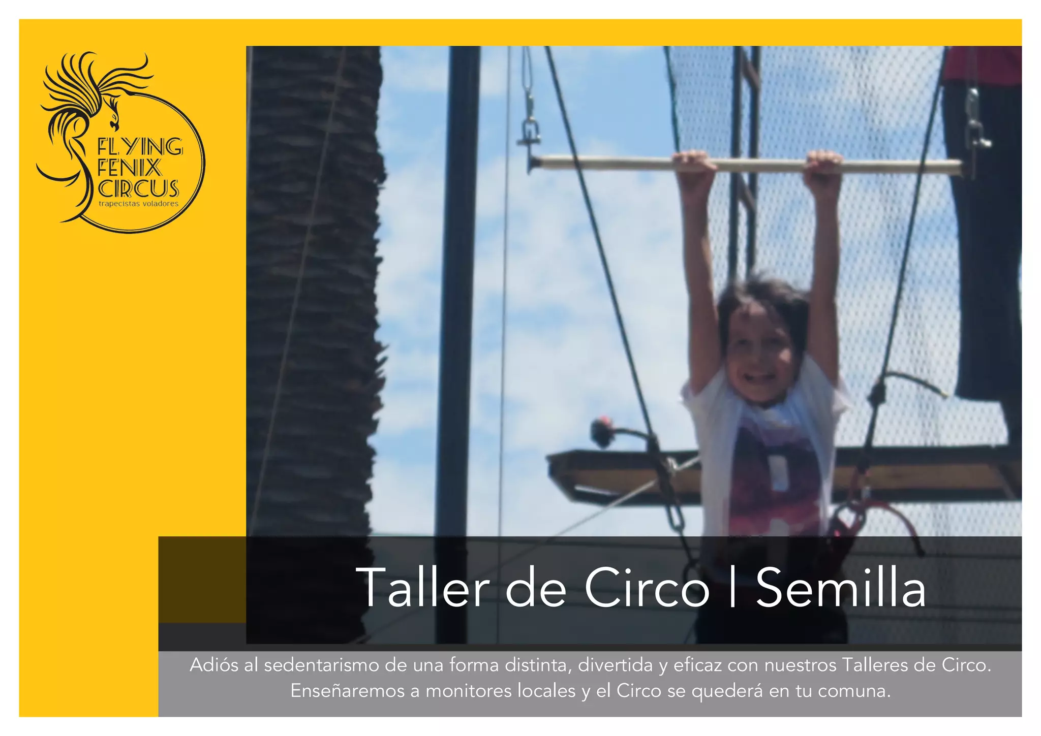 La compañía Flying Fenix Circus ofrece talleres de circo para combatir el sedentarismo, capacitando a monitores locales para impartir clases a la comunidad. Su proyecto Semilla incluye una semana de formación presencial y apoyo posterior, centrándose en actividades circenses como el trapecio volador y acrobacias. Los estudiantes logran desarrollarse físicamente a través de técnicas circenses, culminando en una presentación comunitaria al final del taller.