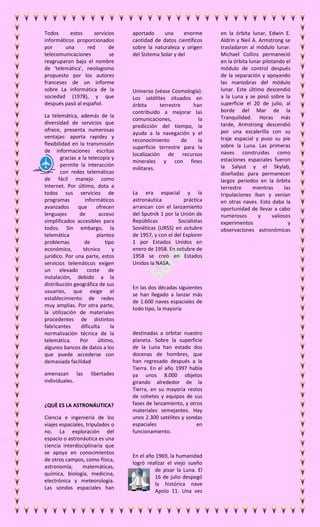 El documento proporciona información sobre varios temas tecnológicos como la cibernética, la telemática, la astronáutica y la robótica. Explica que la cibernética estudia el control y regulación de sistemas, la telemática combina telecomunicaciones e informática para ofrecer servicios de comunicación, la astronáutica se refiere a la exploración espacial mediante naves tripuladas o no tripuladas, y la robótica es el estudio y desarrollo de robots automatizados.