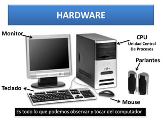 El documento habla sobre las partes básicas de hardware y software de una computadora, incluyendo el monitor, CPU, teclado, mouse, Windows, el explorador de Windows, Microsoft Word, Microsoft Excel e Internet. Explica que el hardware son las partes físicas que se pueden ver y tocar, mientras que el software son programas que nos ayudan a interactuar con la computadora de manera más fácil a través de Windows y nos permiten procesar texto, hojas de cálculo y acceder a información en Internet.