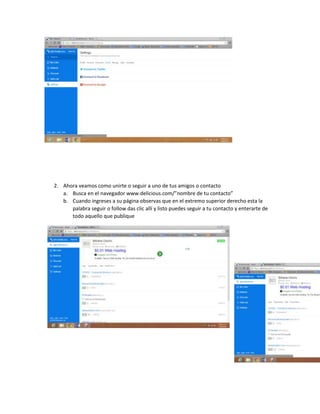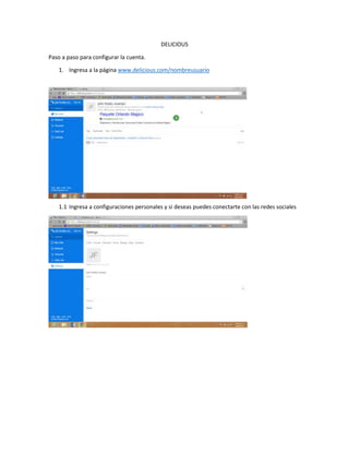 El documento proporciona instrucciones paso a paso para configurar una cuenta en el sitio web Delicious y compartir enlaces con otros usuarios. Explica cómo buscar y seguir a contactos, agregar enlaces propios clasificándolos con títulos y guardar cambios, y añade que es importante tener una cuenta como Delicious para compartir fácilmente información interesante con amigos y compañeros.