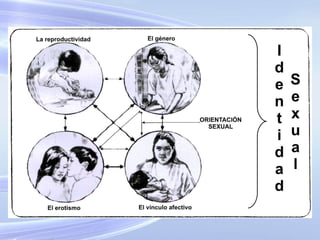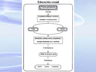 Este documento trata sobre la educación sexual. Define la sexualidad como un aspecto central del ser humano que abarca el sexo, la identidad de género, la orientación sexual y más. Explica que la educación sexual debe adaptarse a cada etapa de desarrollo e implica la formación de valores y actitudes positivas hacia la sexualidad. También critica los métodos tradicionales de educación sexual que enfatizan la prohibición y ocultamiento, y propone enfoques basados en la verdad, el respeto y la responsabilidad.