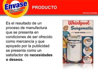 El documento describe las funciones de los envases, empaques y embalajes de productos. Define tres tipos de envases primarios, secundarios y terciarios que cumplen funciones de contención, protección, cuantificación y dosificación de productos. También explica que los envases, empaques y embalajes tienen funciones estructurales y de comunicación como identificación, promoción, atracción y efecto espejo para los consumidores. Las funciones del embalaje incluyen la unificación, protección, compresión, exhibición, control y transport