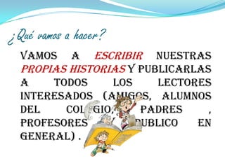 El taller de escritores permitirá a los estudiantes escribir y publicar sus propias historias utilizando cuadernos, lápices y creatividad. El taller se llevará a cabo durante los primeros 20 minutos de clase todos los días para que los estudiantes puedan escribir y compartir sus historias con amigos, compañeros de clase, padres, maestros y el público en general.