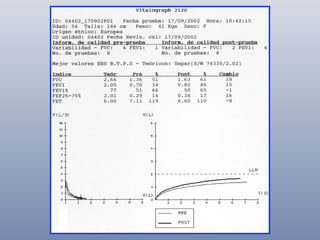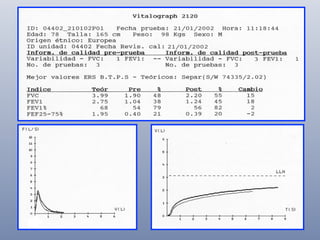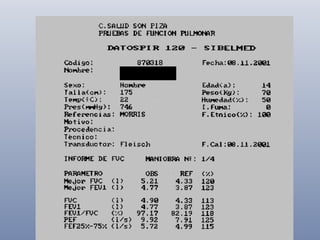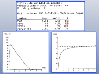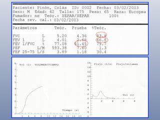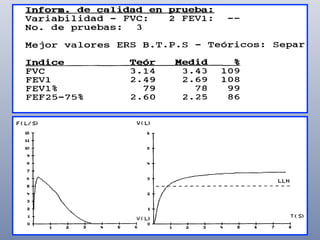 Este documento proporciona información sobre espirometría, incluyendo conceptos básicos, tipos de equipos, parámetros medidos, interpretación de resultados, pruebas broncodilatadoras, y aspectos prácticos como calibración, mantenimiento e instrucciones para pacientes. Explica cómo medir volúmenes y flujos pulmonares forzados para evaluar la función pulmonar y diagnosticar condiciones como asma u obstrucción de las vías respiratorias.